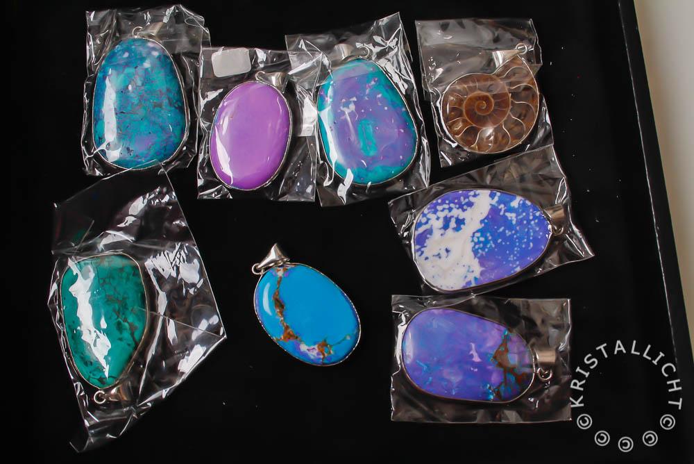 7 geverfde halfedelsteen hangers in tinten blauw/groen/lila